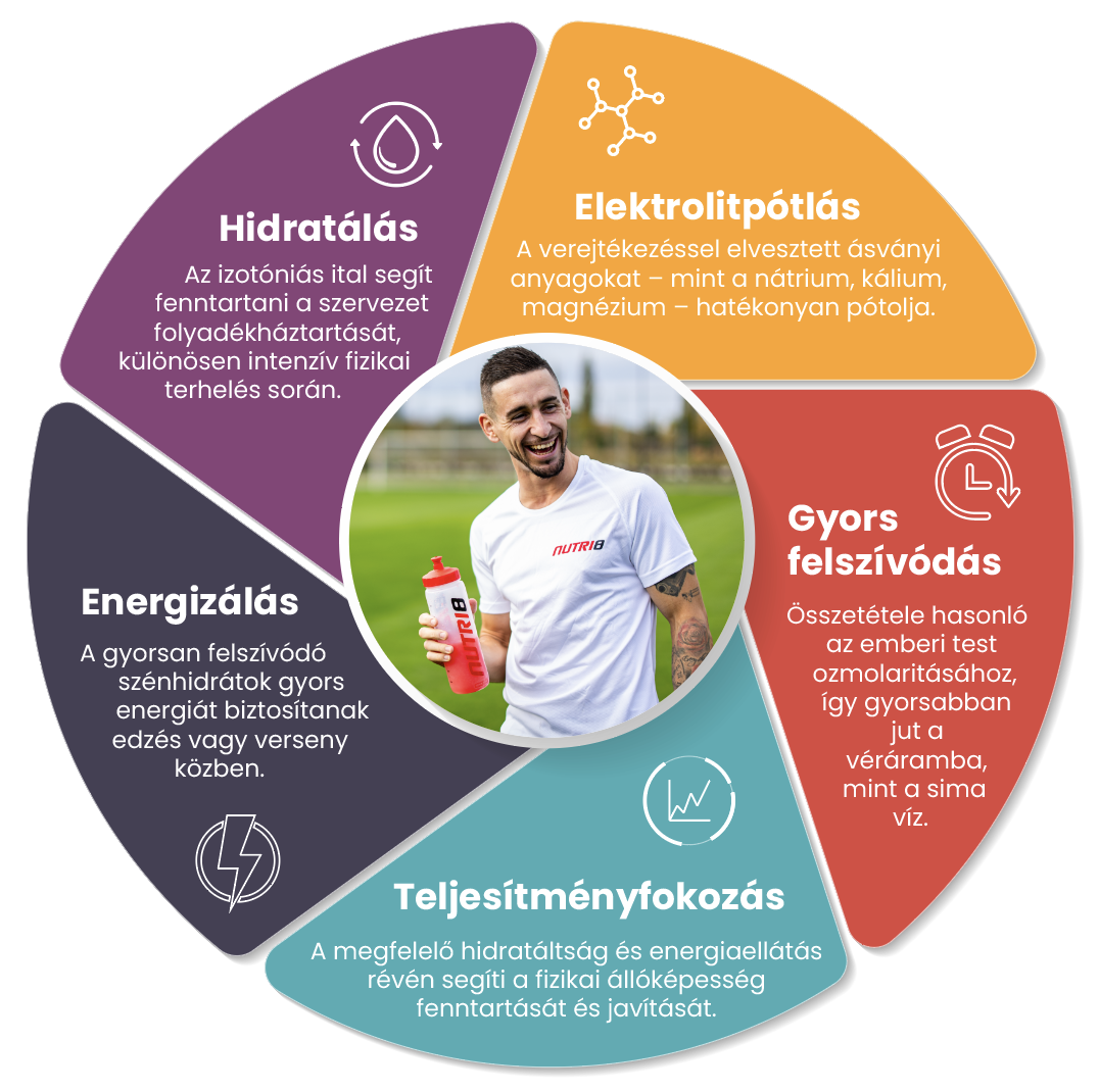 - Egy kutatás szerint az izotóniás ital hatékonyabban tartja fenn a szervezet folyadékegyensúlyát, mint a sima víz, és segít megelőzni a kiszáradást edzés közben. Ezáltal hozzájárul a jobb teljesítményhez és gyorsabb regenerációhoz. (Pałka, T., Koteja, P. M., Tota, Ł., Rydzik, Ł., Kopańska, M., Kaczorowska, I., Javdaneh, N., Mikulakova, W., Wolski, H., and Ambroży, T. (2023). The Influence of Various Hydration Strategies (Isotonic, Water, and No Hydration) on Hematological Indices, Plasma Volume, and Lactate Concentration in Young Men during Prolonged Cycling in Elevated Ambient Temperatures. Biology, 12(5), 687. https://doi.org/10.3390/biology12050687) https://pmc.ncbi.nlm.nih.gov/articles/PMC10215457/#abstract1